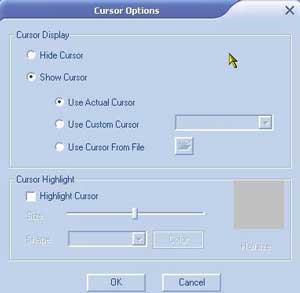 Nếu bạn muốn dấu con trỏ chuột trong quá trình ghi hình, bạn đánh dấu vào tùy chọn Hide Cusor. Ngược lại, ở tùy chọn Show Cursor có 3 tùy chọn khác nhau. Nếu bạn muốn hiển thị con trỏ chuột hiện thời trong quá trình ghi hình, bạn đánh dấu vào tùy chọn Use Actual Cusor. Nếu bạn muốn sử dụng 1 con trỏ khác do chương trình cung cấp thì đánh dấu vào tùy chọn Use Custom Cursor và chọn 1 biểu tượng con trỏ trong danh sách các con trỏ chuột của chương trình. Ngược lại, nếu bạn muốn sử dụng 1 biểu tượng con trỏ khác trong số các con trỏ mà bạn chứa trong máy tính của mình, thì bạn chọn Use Cursor from file và click vào Browse để chọn đến biểu tượng con trỏ muốn sử dụng.